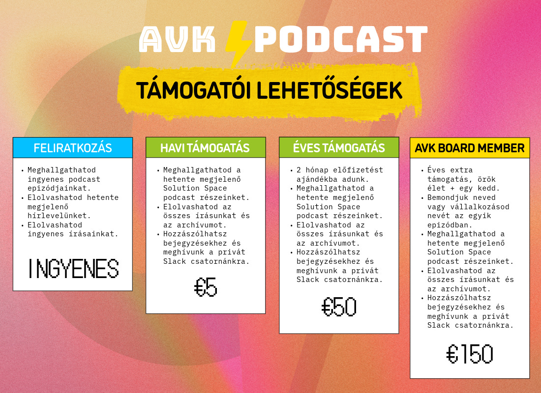 Ha szívesen támogatsz minket, akkor hozzáférhetsz extra tartalmainkhoz: meghallgathatod a Solution Space podcast epizódjait, elolvashatod összes megjelenő írásunkat, hozzászólhatsz a bejegyzésekhez böngészheted a teljes archívumot is és meghívunk privát, támogatói Slack csatornánkra.