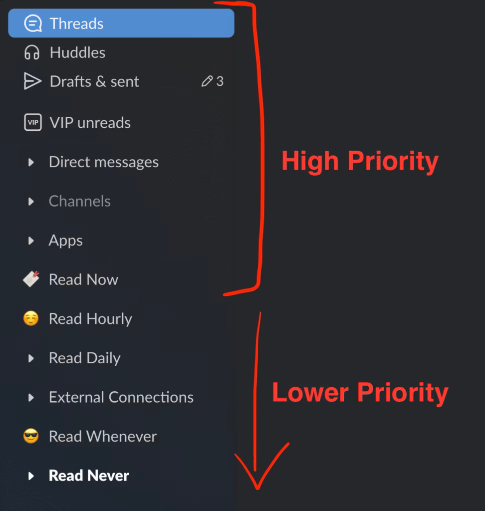 kisPocok talált egy rövid, de annál remekebb írást: a “what” avagy kik/melyik csapatok/milyen rendszerek helyett a “how often” szerint csoportosíts: milyen gyakran kell ránézned az adott üzenetre.